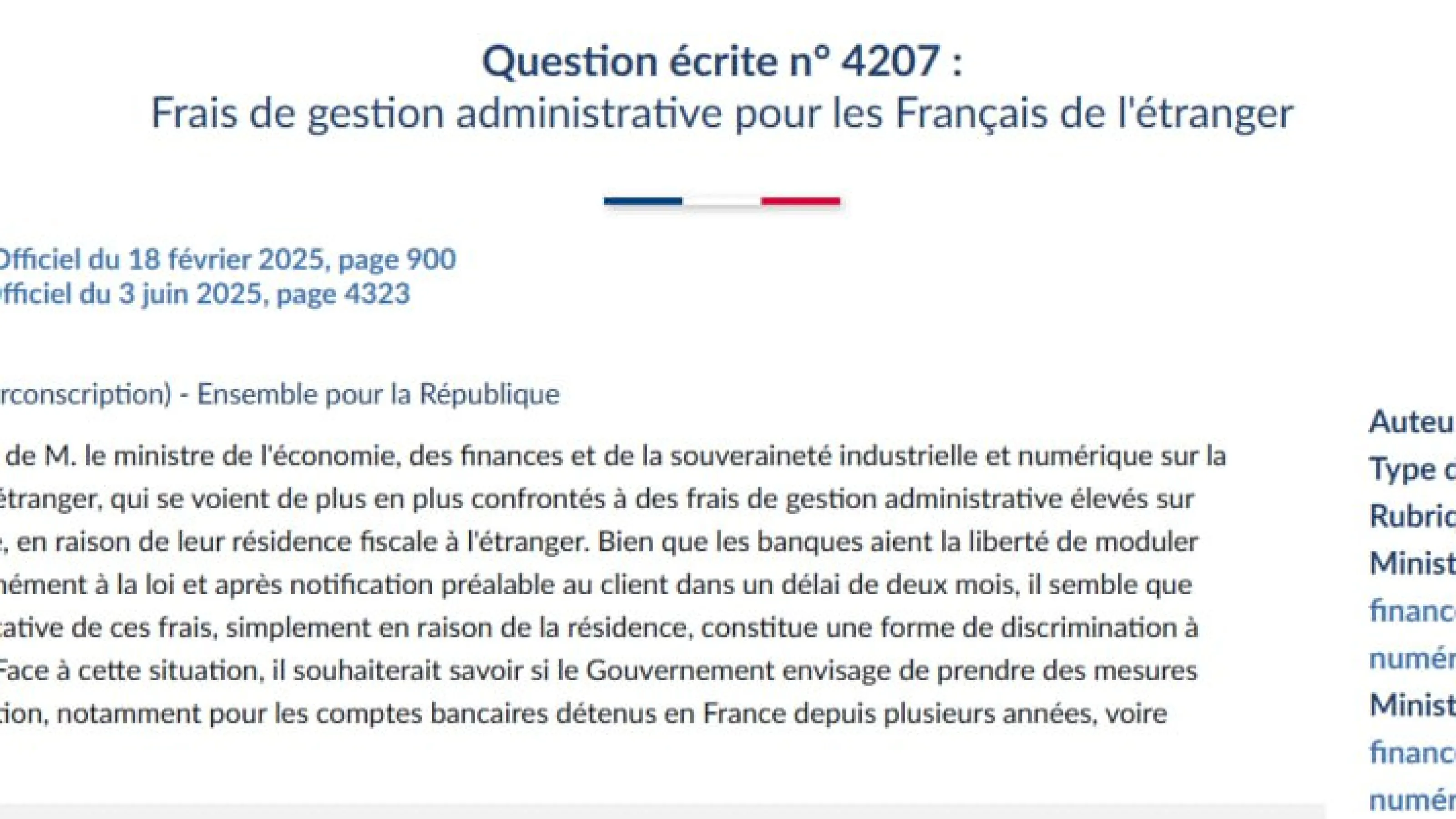 Minister's answer to my question on administrative management fees for French nationals abroad