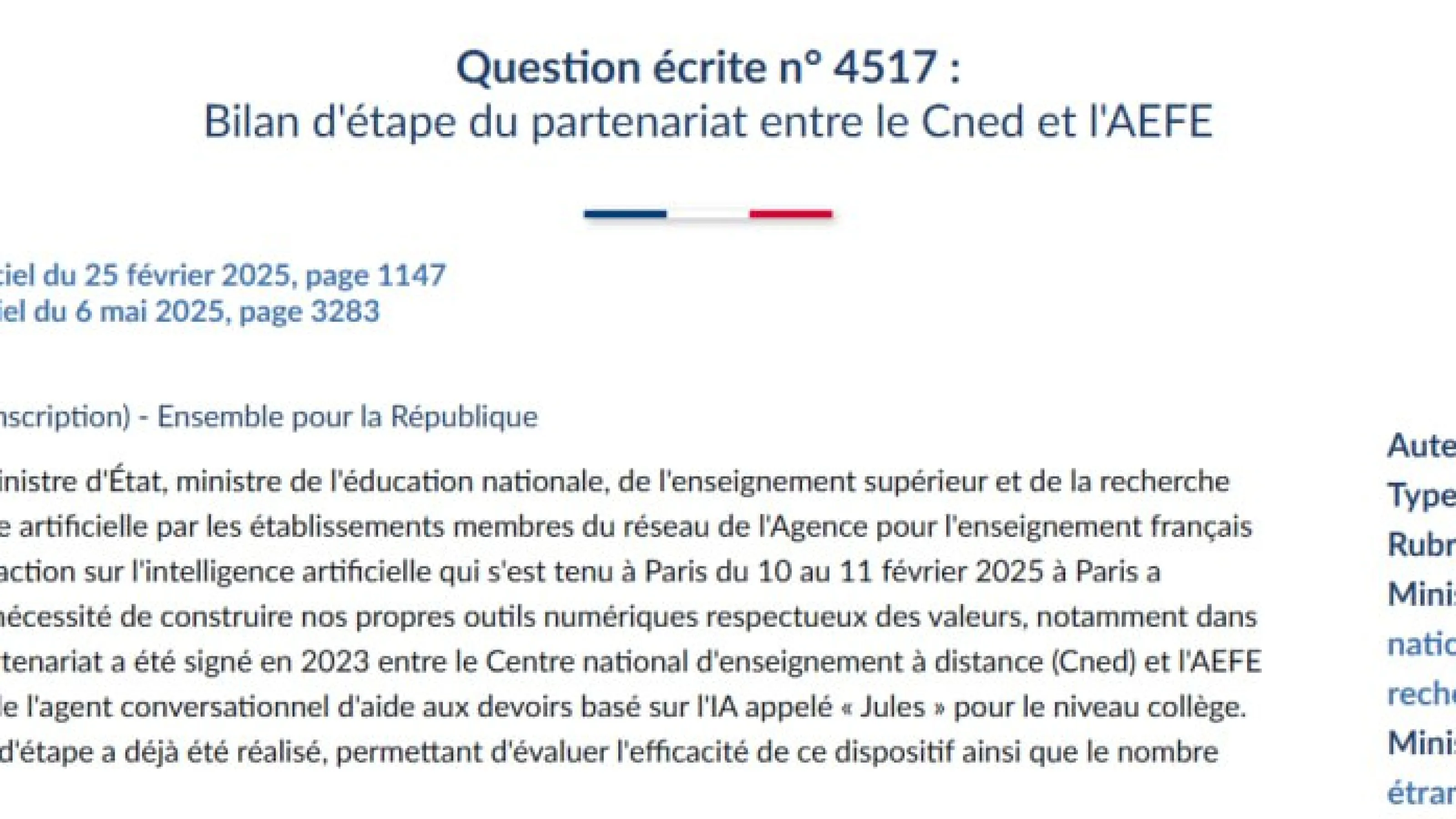 Minister's answer to my question on the progress report on the partnership between the Cned and the AEFE