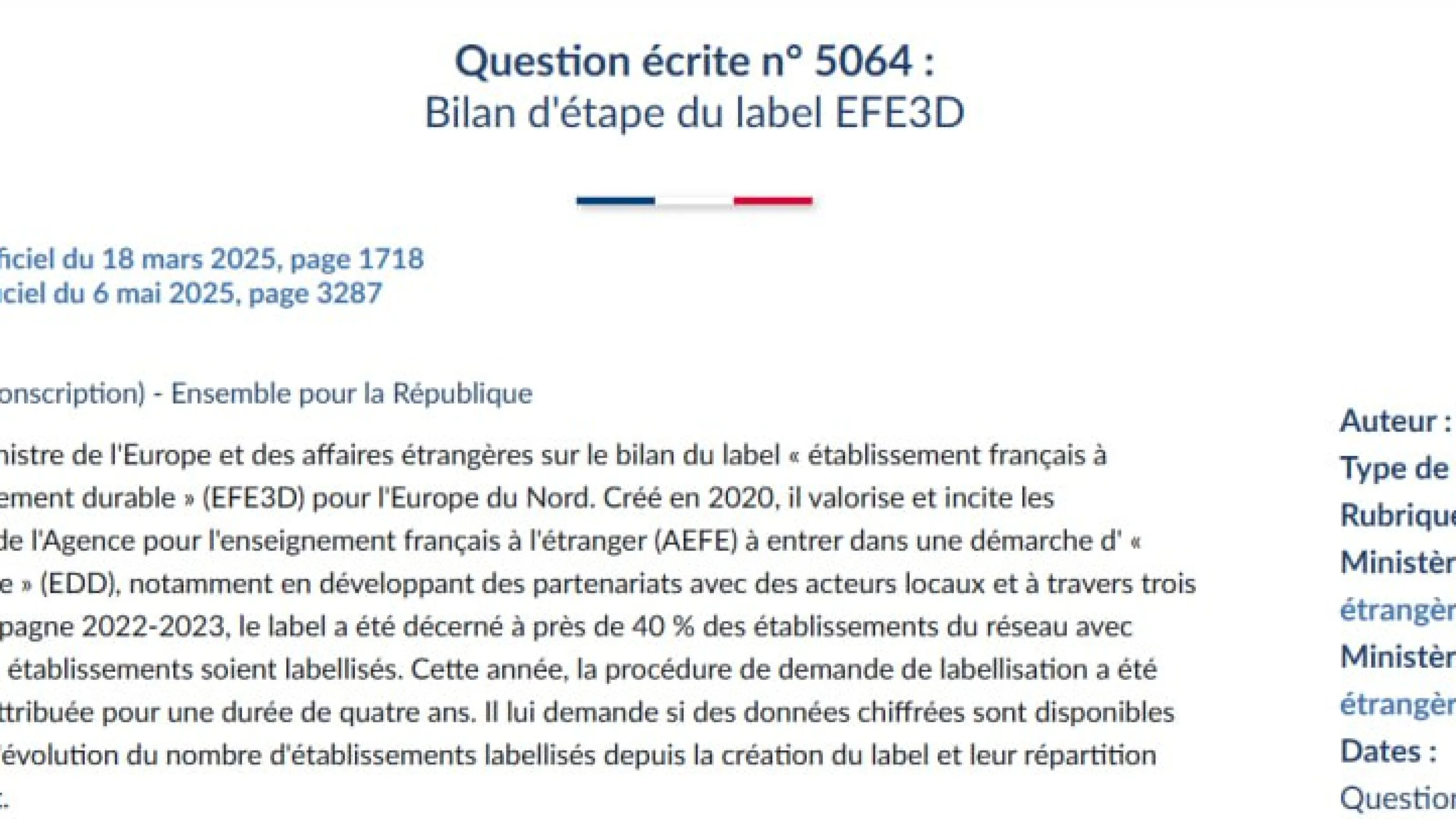 Minister's answer to my question on the progress report on the EFE3D label